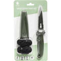 Recycled plastic sheath, the knife can be clipped and unclipped with one hand.